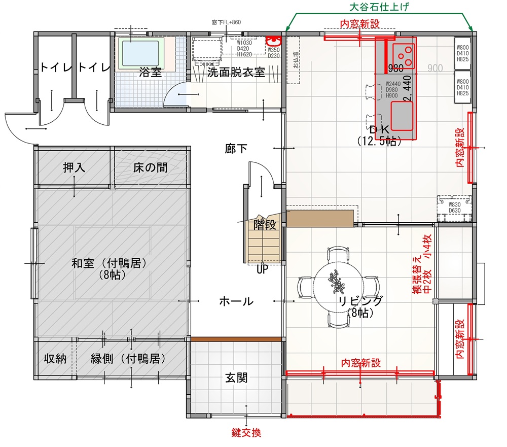 ダイニングキッチンイメージパース 図面及び3Dのパースを作成し、完成後のイメージを共有しながらお打合せをしました。リフォームに伴う家具の配置変更も、図面とパースで確認できます。 |